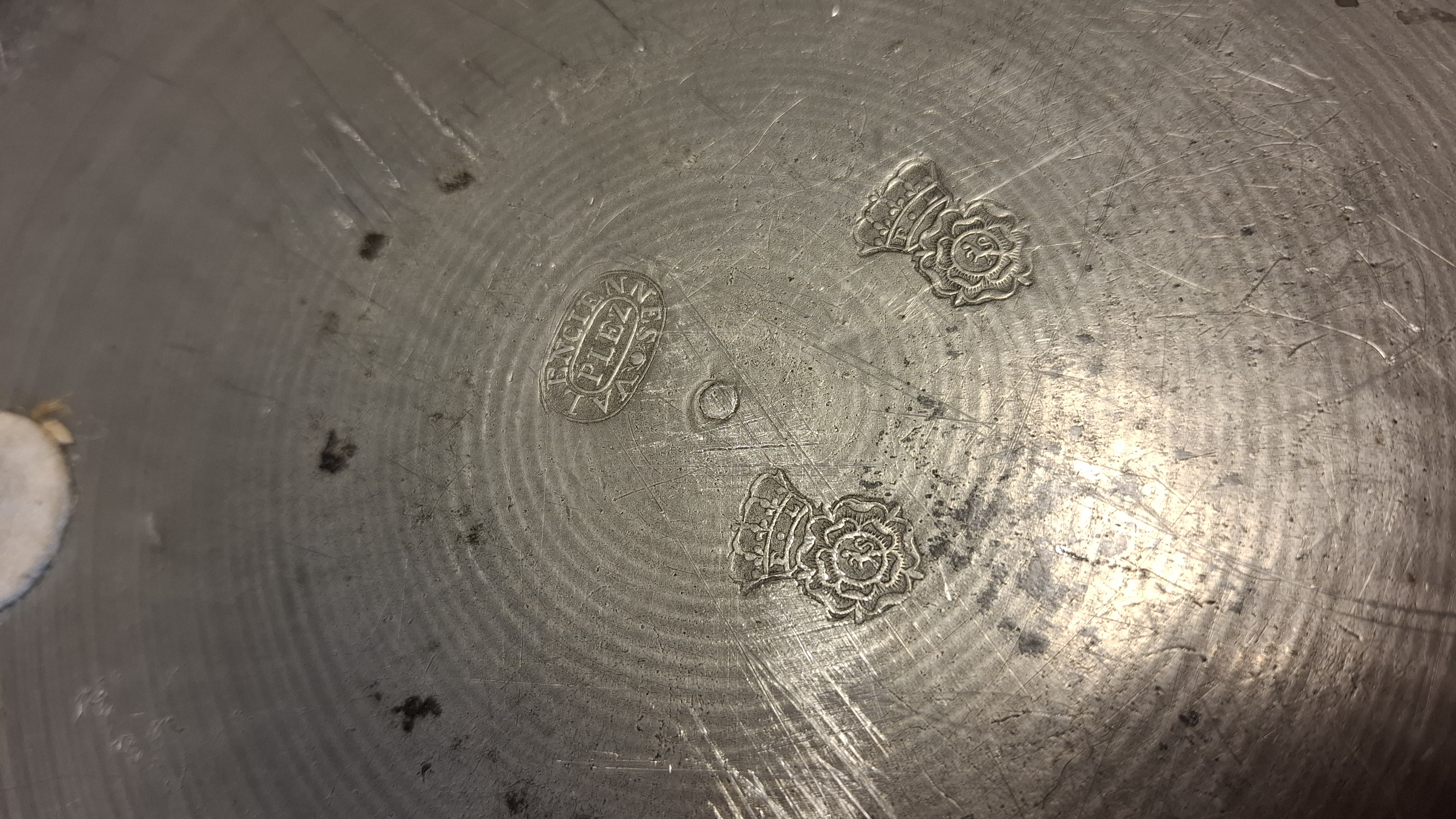 Weet u meer over de 3 merken: jaartal en maker? Ze staan achterop een tinnenbord met opschrift: ‘gasten en versche visch blijven maar vier dagen frisch.’
