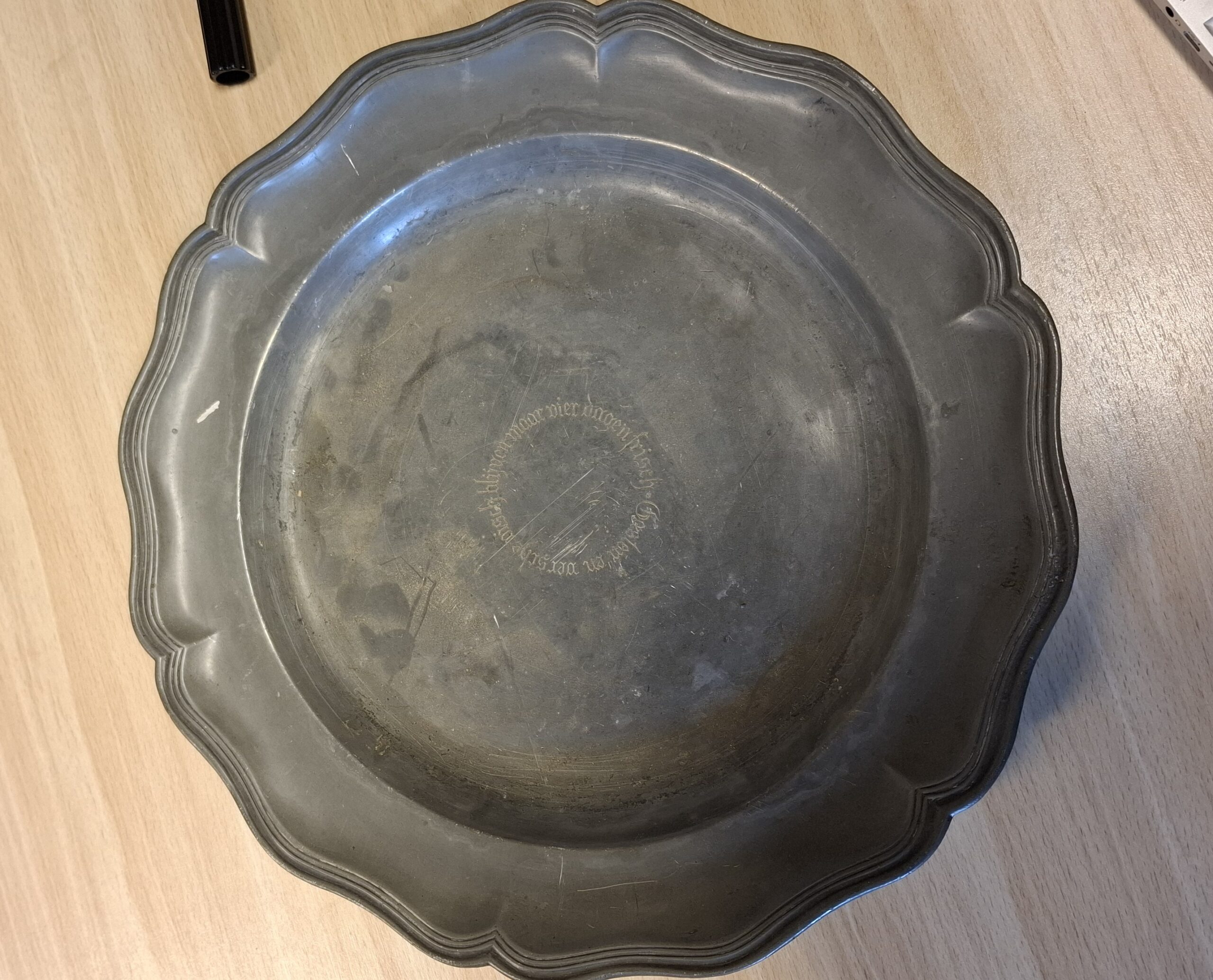 De schotel heeft merken uit twee steden: Valenciennes en Brugge. Dit duidt erop dat we te maken hebben met een schotel uit de 19e eeuw, een kopie als het ware.